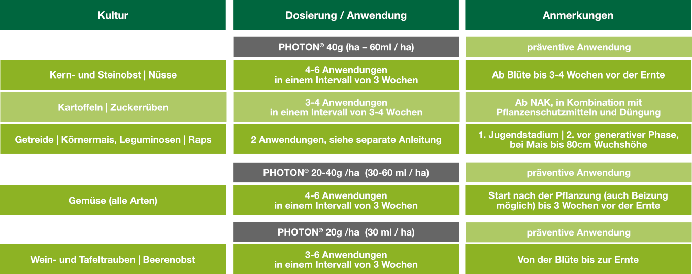 - PHOTON® ist in allen Kulturen einsetzbar kann zu jeder Zeit während der Vegetationsperiode, von der Pflanzung bis in die Ernte angewendet werden, in der Praxis haben sich frühe Anwendungen im Jugendstadium bewährt.